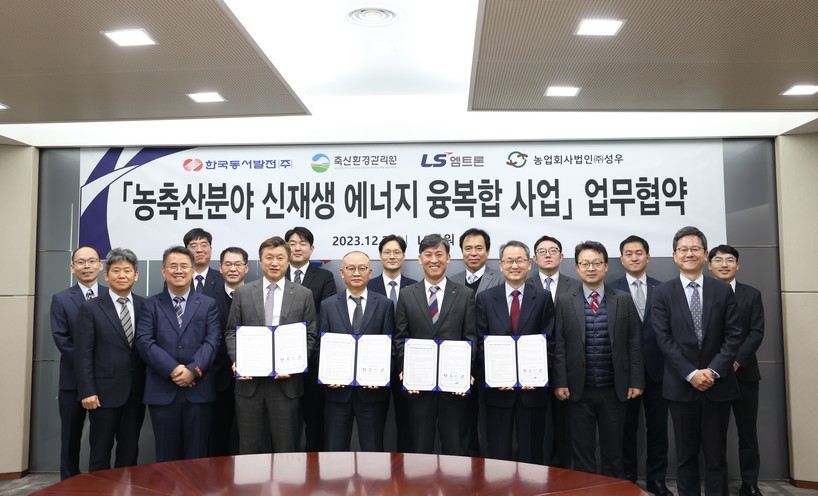 [일요주간=김영란 기자] 한국동서발전㈜(사장 김영문)은 28일(목) 오전 10시 경기도 안양 LS타워에서 LS엠트론㈜, 축산환경관리원, ㈜성우 농업회사법인과 ‘농축산분야 신재생 융복합사업’ 추진을 위한 업무협약을 체결했다.