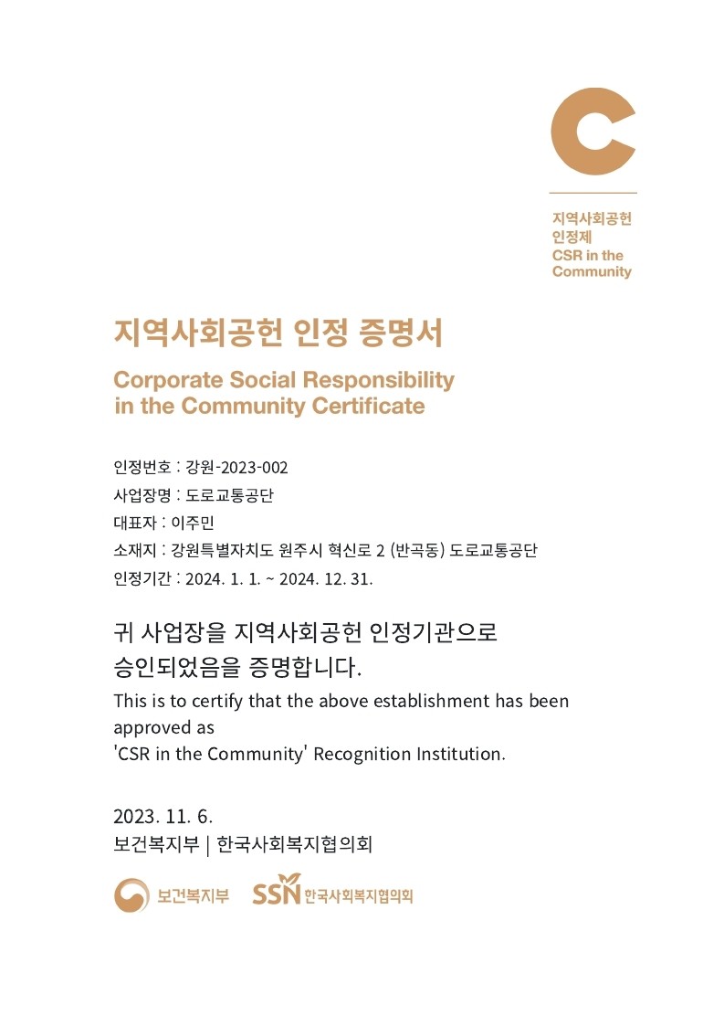 | ▲ 도로교통공단, 지역사회공헌 인정기업(기관) 증명서 (이미지=도로교통공사) |