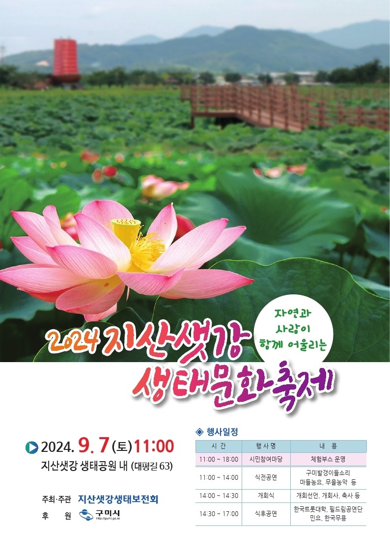 [일요주간=최부건 기자] 구미시 지산동에서는 오는 7일, 도심 속 힐링 명소인 지산샛강생태공원에서 ‘2024 지산샛강 생태문화 축제’를 개최한다.