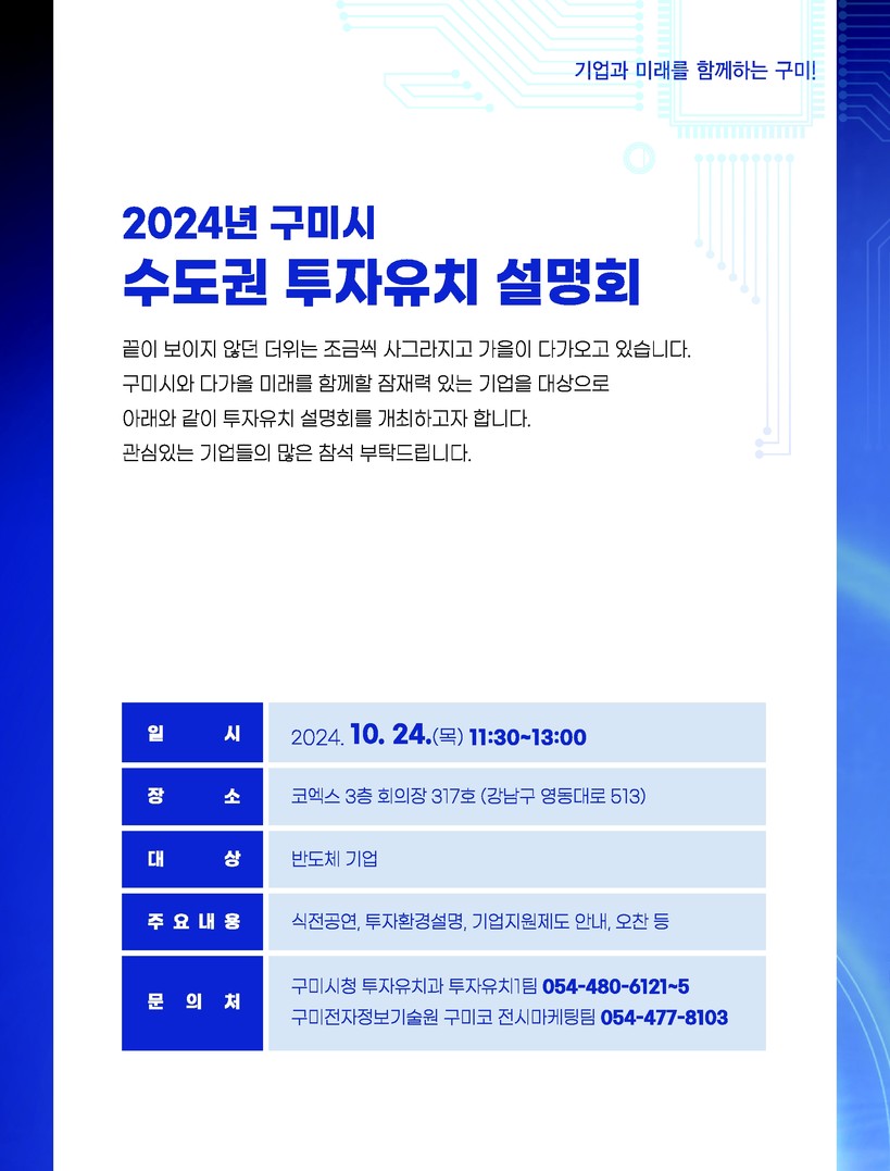 이번 설명회에서는 구미시의 투자 여건과 지원 정책을 설명하는 발표 외에도 오찬 및 네트워킹 기회를 제공하여, 참가 기업들이 유익한 정보 교류와 잠재적 파트너십 구축의 기회를 가질 수 있을 것으로 기대된다.