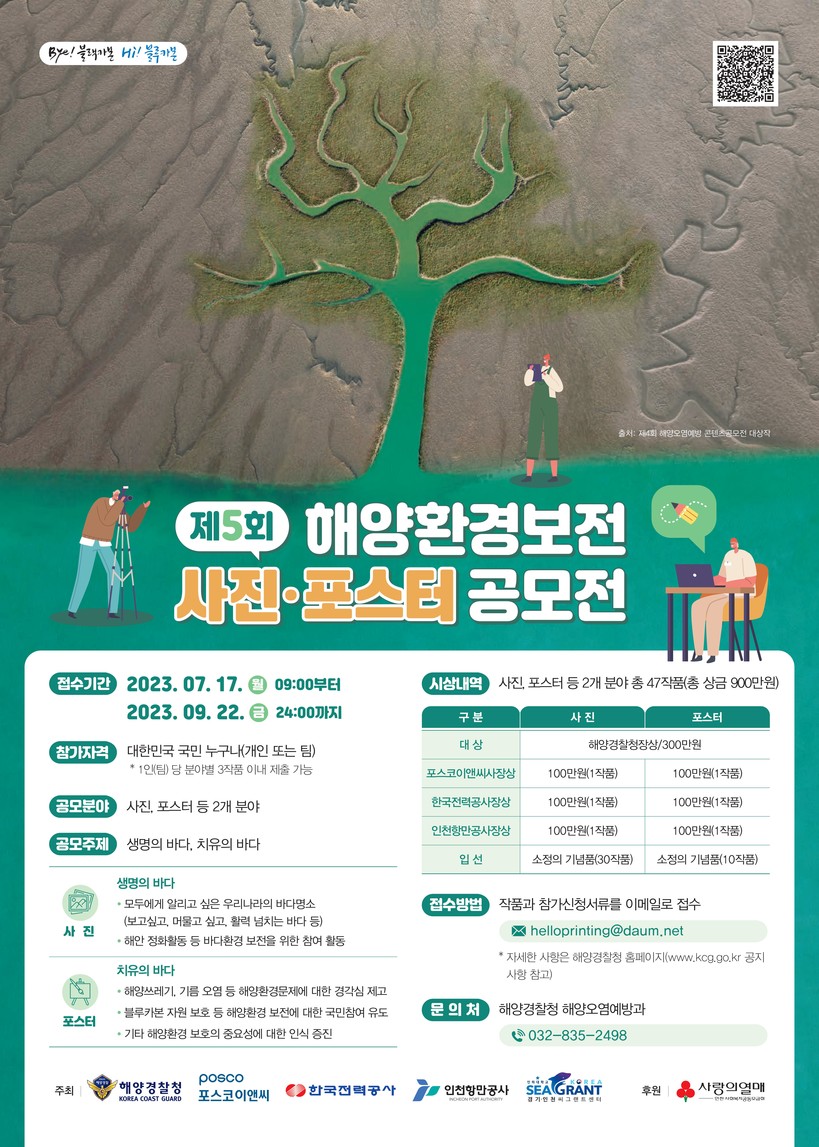 [일요주간=김영란 기자] 인천항만공사(www.icpa.or.kr, 사장 이경규)는 17일부터 9월 22일까지 해양경찰청(청장 김종욱), 포스코이앤씨(사장 한성희), 한국전력공사, 경기·인천씨그랜트센터(센터장 우승범)와 함께 「제5회 해양환경보전 사진·포스터 공모전」을 개최한다고 밝혔다.