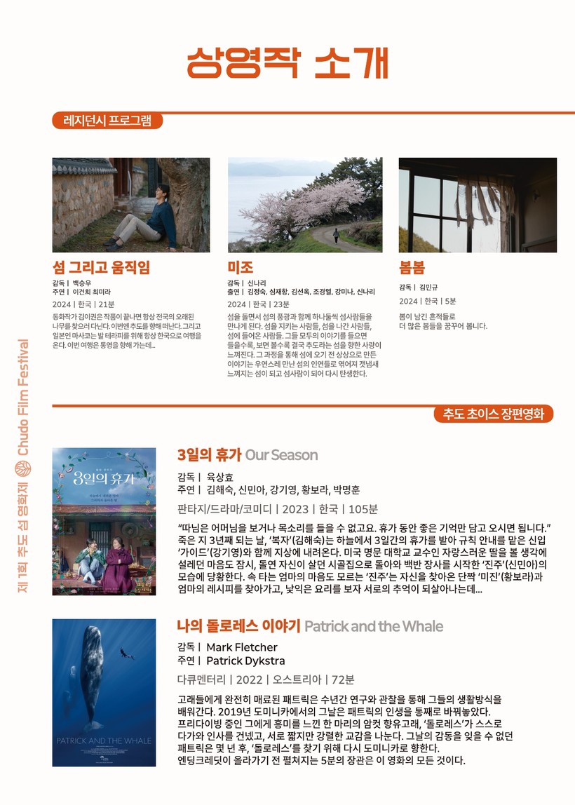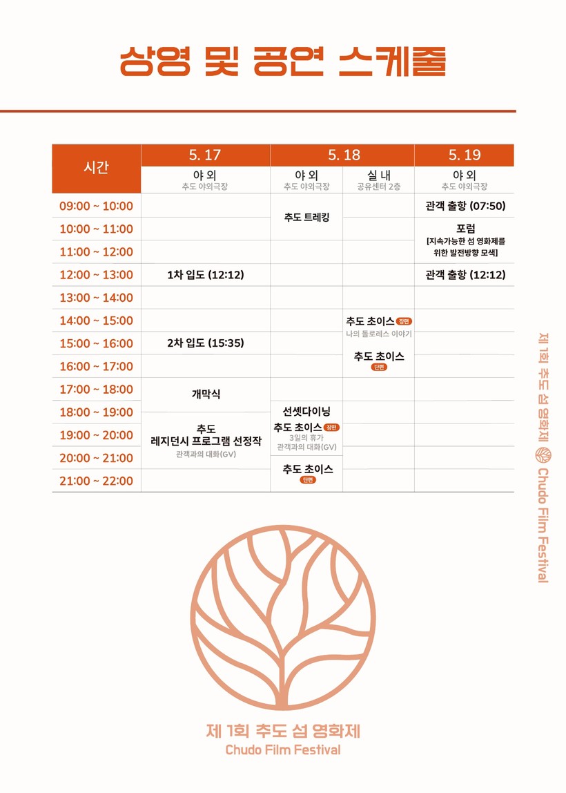 ‘제1회 섬 영화제’는 복효근 시인의 ‘섬의 동사형’이라는 주제로 ▲지역 체류 단편영화 제작 ▲감독과 영화인이 만나는 관객과의 대화 ▲푸드 스타일리스트와 섬 주민들이 함께 차려내는 ‘선셋 다이닝’ ▲추도의 아름다운 길 등산로 탐방 ‘이바구 트레킹’ ▲지속가능한 섬 영화제 발전방향을 위한 ‘영화제 포럼’ 등을 준비하였다.