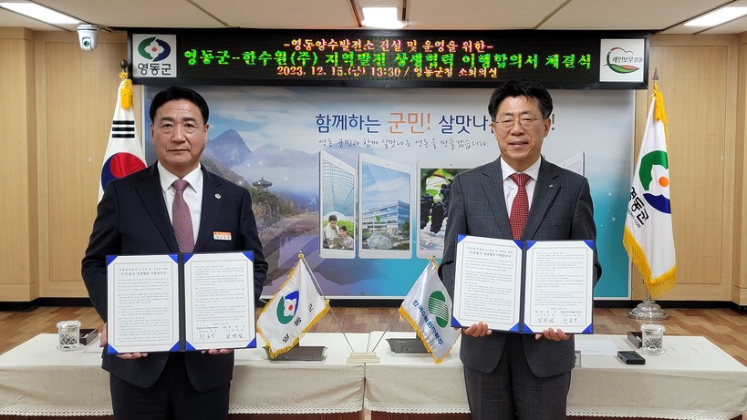 [일요주간=김영란 기자] 한국수력원자력(사장 황주호, 이하 한수원)이 15일 충북 영동군청에서 영동군과 ‘지역발전 상생협력 이행합의서’를 체결했다.
