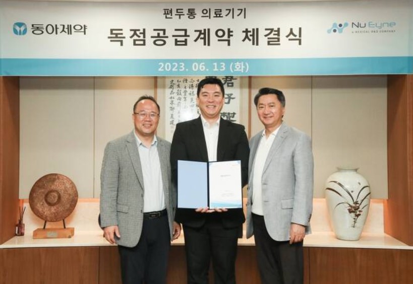 | ▲왼쪽부터 백상환 동아제약 대표이사 사장, 김도형 뉴아인 대표이사, 최호진 동아제약 부회장. (사진=동아제약 제공) |
