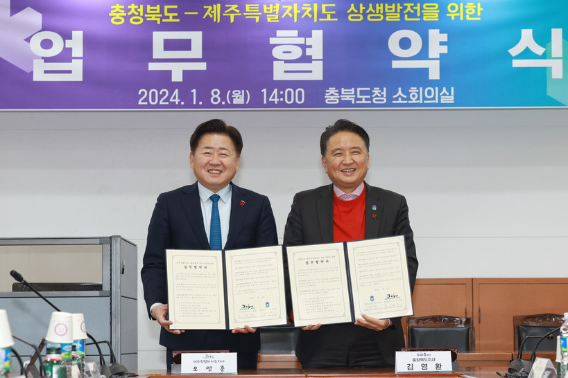 [일요주간=김영란 기자] 충청북도(도지사 김영환)와 제주특별자치도(도지사 오영훈)는 8일 상호 교류 확대와 상생 발전을 위한 업무협약을 체결했다.