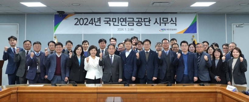 ▲ `24.1.2.(화) 국민연금공단 본부에서 열린 2024년 시무식을 마치고 김태현 이사장이 임직원들과 함께 기념촬영을 하고 있다. (사진=국민연금공단) |