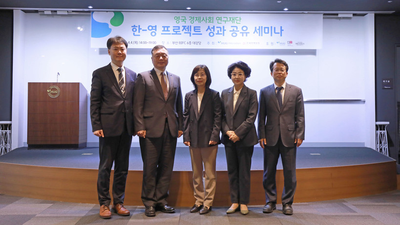 ▲ 4일 HUG 부산 본사(BIFC) 6층 대강당에서 진행된 ‘영국 경제사회 연구재단 한-영 프로젝트 성과 공유 세미나’ 개회식 후 참석자들이 기념 촬영을 하고 있다_왼쪽부터 차례대로 허지행 HUG 주택도시금융연구원장, 유병태 HUG 사장, 조영하 옥스퍼드 브룩스 대학 교수, 진미윤 한국주택학회 회장, 최종원 HUG 경영인프라혁신단장 (사진=HUG) |