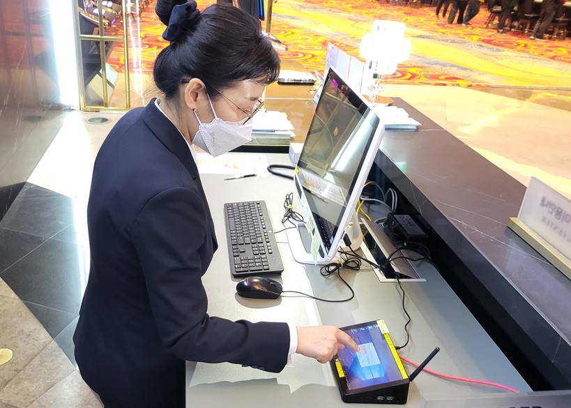▲ 강원랜드 직원이 영업장에서 긴급호출시스템을 작동하고 있다. (사진=강원랜드) |