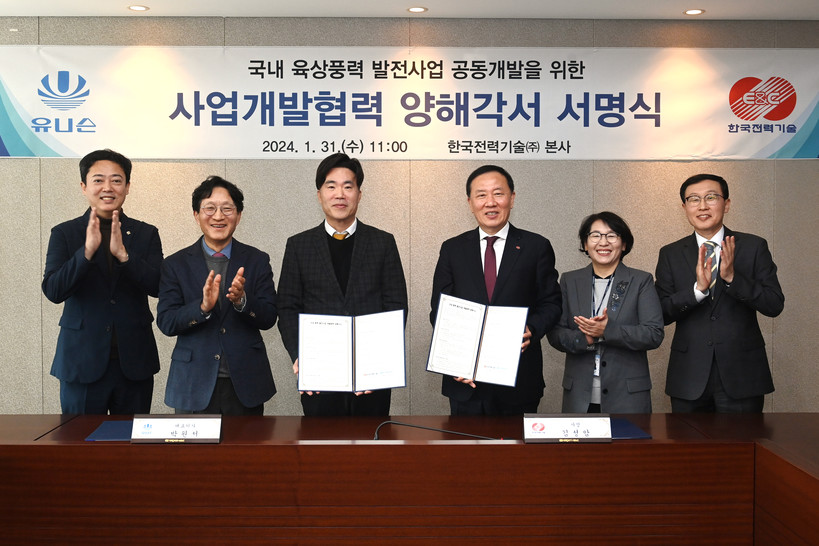 [일요주간=김영란 기자] 한국전력기술(사장 김성암)은 31일 국내 풍력발전기 제조업체인 유니슨과 국내 풍력 발전사업 개발협력 양해각서를 체결했다. 한국전력기술 김천 본사에서 열린 체결식에는 한국전력기술 김성암 사장, 유니슨 박원서 대표이사를 비롯한 양사 관계자들이 참석했다.
