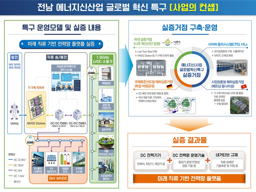 1단계로 2024~2027년 나주 혁신산단 일원에 국내 실증을 위한 상용실험장(Live Test-Bed)을 구축한다. 사이버·물리시스템(CPS), 힐스(HILs) 장비를 활용 직류(DC)에서 발생하는 다양한 사고 및 환경 변화를 모의실험하고 독일, 베트남 등 해외실증거점과 연계해 글로벌 표준과 기준을 마련한다.
