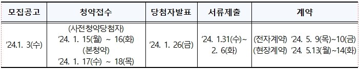 - 청약신청(1월 15~18일), 당첨자발표(1월 26일), 계약체결(5월 9~14일)