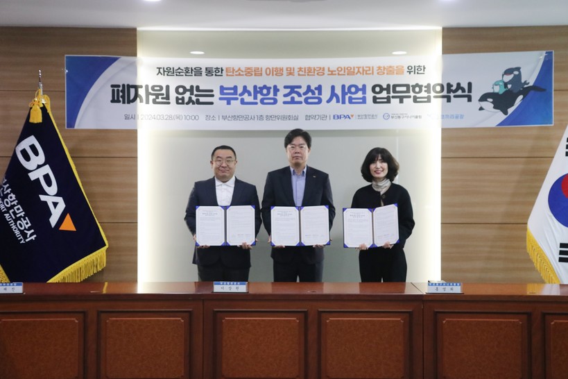 [일요주간=김영란 기자] 부산항만공사(BPA, 사장 강준석)는 28일, PET 자원순환을 통한 탄소중립 이행 및 친환경 노인일자리 창출을 위해 부산동구시니어클럽, ㈜코끼리공장과 ⌜폐자원 없는 부산항 조성사업⌟ 업무협약을 체결했다고 밝혔다.