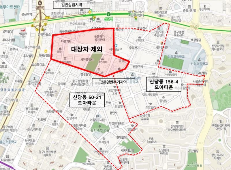 중구 신당동 122-3 일원(면적 63,085㎡)는 인근 지역의 총 3개소의 모아타운 대상지로 선정되어 관리계획을 수립중이었으나, 이중 1개소의 주민들이 타사업추진(역세권 장기전세주택 등)을 희망하여 대상지에서 제외하였다.