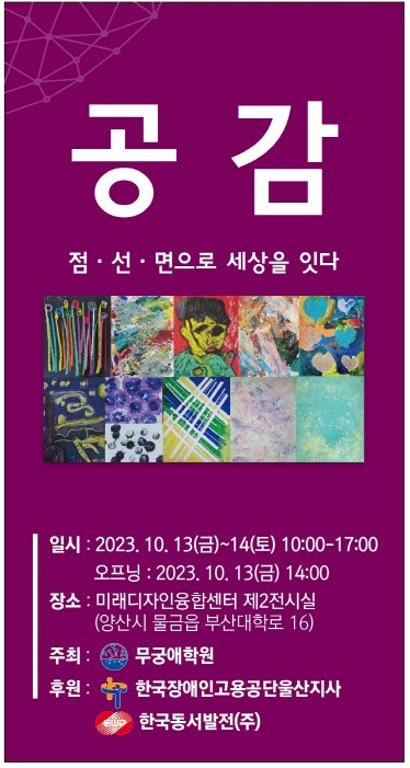 인턴과정에는 60명의 중증발달장애인이 참여했으며, 미술분야 인턴 11명이 지난 6월부터 3개월간 작업한 작품을 전시하는 행사가 13·14일 양일간 경남 양산 미래디자인융합센터 제2전시실에서 ‘공감-점‧선‧면으로 세상을 잇다’를 주제로 열린다. 전시회는 장애인거주시설 무궁애학원의 개최로 13일 오후 2시 오픈한다.