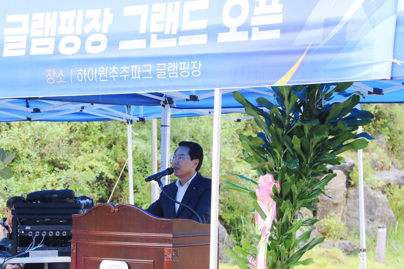 ▲ 하이원추추파크 글램핑 오픈 기념식에서 격려사를 하고 있는 이삼걸 강원랜드 대표이사 (사진=강원랜드) |