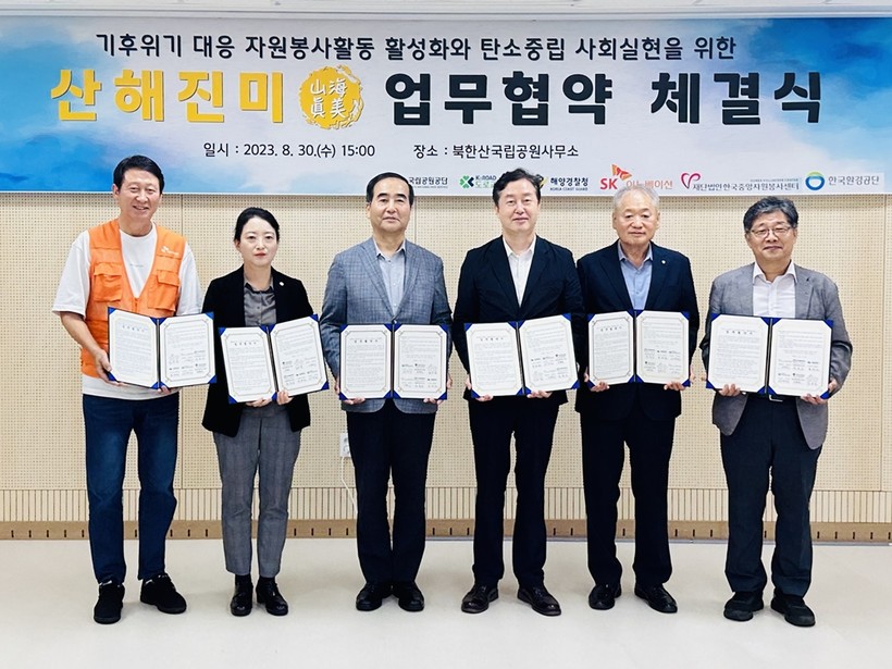 [일요주간=김영란 기자] 도로교통공단(이사장 이주민)은 북한산 국립공원 사무소에서 SK이노베이션, 중앙자원봉사센터, 해양경찰청, 한국환경공단, 국립공원공단’과 『탄소중립 및 ESG 경영』을 위한 업무협약을 체결했다.