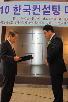 [일요주간= 신현호 기자] 지난 5월 28일 서울 프레스센터에서 열린 ‘2010 한국 컨설팅 대상’에서 ㈜홍익산업(대표 김광승)이 건설부문 대상을 수상했다. 한경비즈니스가 주최하고 국민대경영연구소가 후원, 한국지식정보진흥원이 주관한 이번 행사는 신한PB, HP, 아시아나, 안철수 연구소 등 컨설팅부분의 우수 업체 10개를 선정해 수상했다.