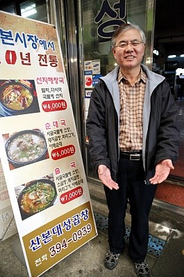 산본대성곱창(blog.naver.com/kjs2300789) 김준수 사장은 산본시장 진흥협동조합 이사장으로 조합원들의 권익보호를 위해 다양한 활동을 하고 있다. 가게입구는 그렇게 화려하지 않지만 의자에 앉자 먹을 수 있는 공간과 좌식형태의 공간으로 구분되어 있다.