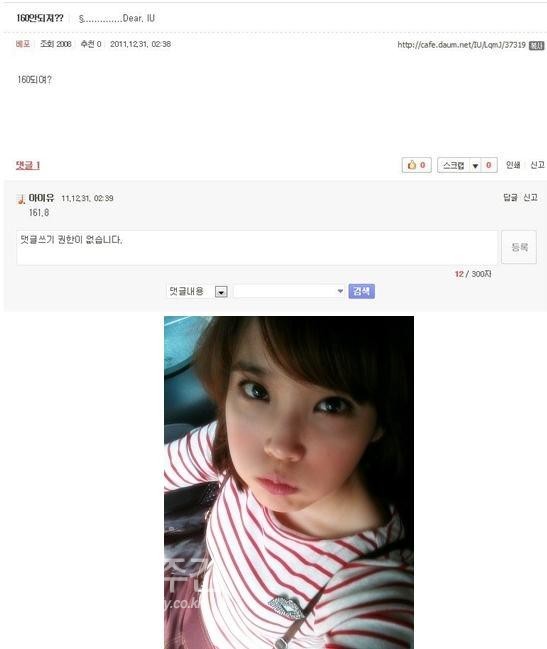 아이유의 팬까페 ‘유애나’에 한 팬이 “(키) 160cm 되요?”라는 질문을 올렸다.