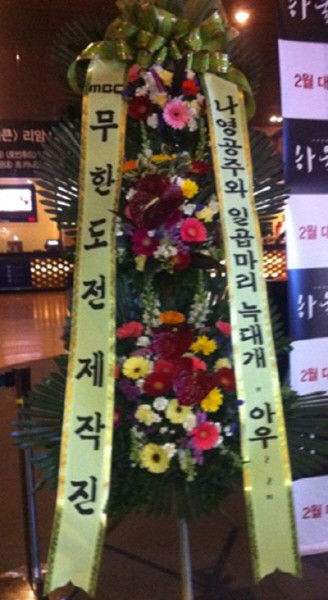 화환에는 '나영공주와 일곱마리 늑대개, 아우~~'라는 센스 넘치는 문구로 시사회에 참석한 사람들의 눈길을 끌었던 것.