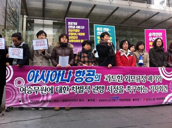 - 이번 기자회견은 작년 초에 0.8 기압에서 서서 일하는 사람들, 공항에서 일하는 사람들이 하지 정맥류 등 예방하는 차원에서 산업안전보건위원회에 ‘압박스타킹을 지급하라’고 요구한 적이 있습니다. 하지만 받아들여지질 않았어요. 그리고 작년 4/4분기에 추위 때문 승무원들과 직원전체 바지 유니폼을 제작해 달라고 했어요. 이것을 요청하고 내부적으로 이런 문제를 가지고 회사와 교섭을 하려고 노력하고 있던 중 지난 5일 A언론사에서 제보를 받고 기사를 보도했습니다. 그리고 여성단체에서 많은 관심을 보였고 민노총에서도 복장과 규제에 대해 이야기를 해야 된다고 해서 민노총에서 먼저 준비하고 기자회견을 한 것입니다.