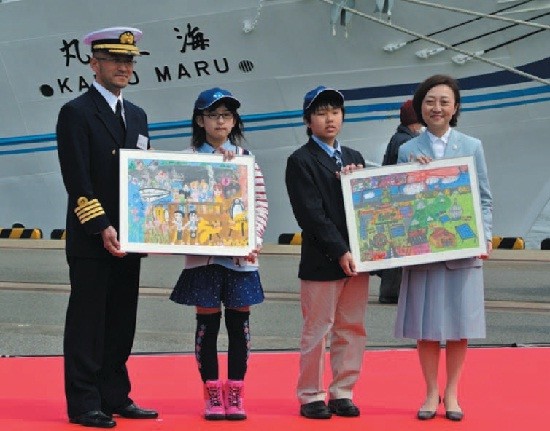 이에 일본관 깃발과 어린이들의 그림을 전달받은 와타나베 선장은“여러분들의 마음을 여수세계박람회와 한국인들에게 잘 전달하겠다”고 말했다. 또 출항식에 참석한 주일 한국대사관의 서형선 공사는 인사말을 통해 카이오마루의 출항을 축하했다.