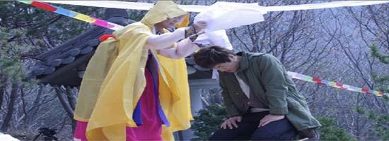 실제 굿을 하는 장면은 국내외에서 진혼굿과 추모굿을 선보이며 동양의 미를 전하는 예술가로 널리 알려진 한국의 대표 무당 중요무형문화재 82-2 김금화 만신이다.