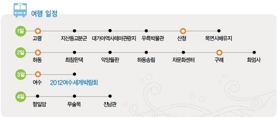 그동안 잘 알려지지 않았던‘가야’의 역사와 문화를 맛볼 수 있는 여행이다. 고령에서 찬란했던 대가야 문화에 흠뻑 취하고, 하동으로 넘어가 차와 문학에 젖어보고 지리산의 장엄한 화엄 불교의 세계인 화엄사를 둘러본 후 여수의 섬과 바다를 감상하는 여행은 무엇 하나 버릴 것이 없다.