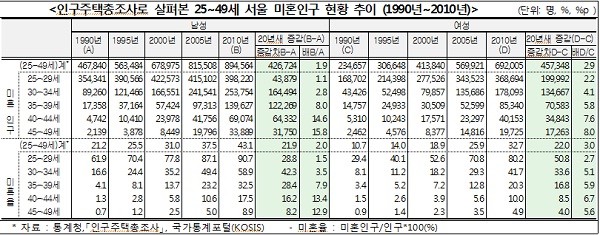발표에 따르면 서울에 살고 있는 30세에서 49세 미혼 남성은 24만3천명으로 20년 새 10배 증가하여 미혼여성의 6.4배보다 가파른 상승세를 보이고 있는 것으로 나타났다.