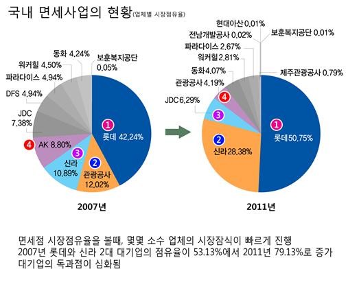 오 위원장은 “현재 수입 양주와 담배, 외산부띡 제품들을 매장 전면에 배치한 롯데면세점의 경우 인천공항 내에서 약 1,669평(전체매장 35%)를 점유하고 있고, 수입 화장품과 향수, 외산 부띡 제품들을 전면에 배치한 신라면세점의 경우 인천공항 내에서 약 2,298평(전체매장 49%)의 넓은 매장을 차지하고 있다”고 설명한다.