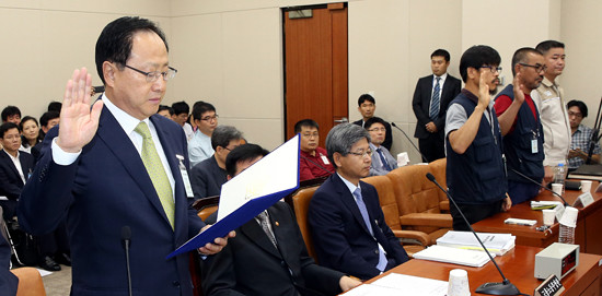 ▲ 20일 오전 국회 환경노동위원회 전체회의장에서 열린 쌍용차 정리해고 관련 청문회에 증인으로 출석한 이유일 쌍용차 대표이사(왼쪽부터)와 한상균 전 금속노조 쌍용차 지부장, 김정우 금속노조 쌍용차 지부장,조운상 쌍용차 노조위원장 직무대행이 선서를 하고 있다.