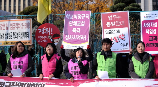 이들이 교육당국에 요구하고 있는 사항은 △호봉제 전환 △교육공무직 법제화 △교육감 직접고용 등으로 앞서 지난 9일 하루 총파업을 벌여 전국 공립 초·중·고 9,647개교 중 12.6%인 1,217개 학교가 급식을 중단했으며 207개교가 단축수업을 한 바 있다.