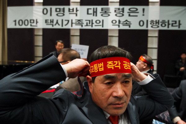 ▲ 한 택시업계 대표가 21일 교통회관에서 열린 비상합동대책위에서 택시법 법안 공포 촉구를 외치며 머리끈을 질끈 동여메고 있다.ⓒNews1