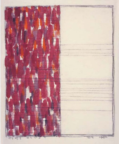 기법적인 측면이서나 문자 그 자체에 매달리기 보다는 확산된 조형적 시도를 선택했다. 다시 말하면 전통적 관점에서 벗어나 선과 선, 선과 면, 면과 면의 관계가 더 중요했다.