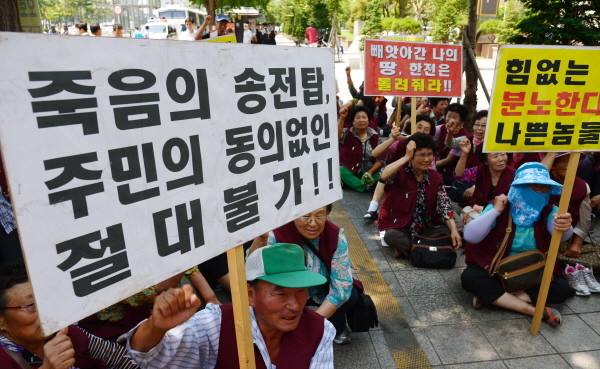 [일요주간=문경원 기자] 군산시 회현면, 옥구읍, 미성동 철탑반대 공동대책위원회 주민들이 지난 3일 오후 서울 여의도 국민은행 앞에서 집회를 열고 새만금 송전탑 경로 변경을 촉구했다.
