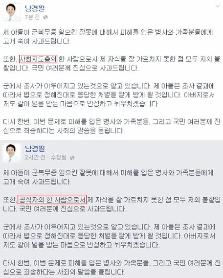 논란이 일자 ‘사회지도층’이라는 표현은 2시간 뒤 ‘공직자의 한사람’으로, 다시 1시간 뒤에 ‘군에 아들을 보낸 아버지’로 모두 3번 수정됐다.