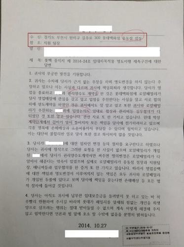 그러면서 “이제 와서 명의변경을 거부하며 매장을 무조건 철거하라는 것은 롯데의 우월적 지위를 이용한 '을'에 대한 핍박이라고 생각한다”며 “이 모든 상황의 책임은 오너일가 C씨의 일방적인 변심으로 인한 것으로 그 책임을 우리에게 돌리는 것이야 말로 갑질이 아니고 무엇이냐” 반문했다.