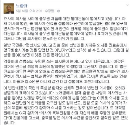 앞서 새정치민주연합 원혜영 의원은 지난 15일 의료법상 '의료인 결격사유'에 '성범죄로 벌금형 이상을 선고받은 의료인'을 추가하는 내용의 의료법 일부개정안을 발의했다.