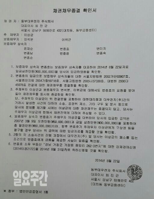 그런데, 이상균 씨는 80여일 후인 지난해 8월 22일 동부대우전자로부터 위 최고서와 관련해 채권채무 종결 확인서(위 사진)를 받았다.
