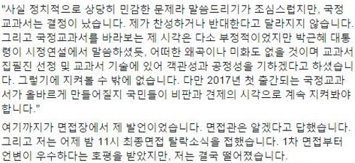 이에 A씨는 “바람직한 결정이라고 할 수 없다”며 “2017년 첫 출간되는 국정교과서가 올바르게 만들어질지에 대해 국민들이 비판과 견제의 시각으로 계속 지켜봐야 된다”고 답했다.