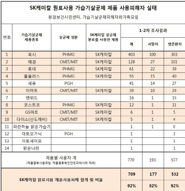 환경보건센터에 따르면 개별 제품별 사용피해자로 구분하면 피해자는 530명에서 770명으로 더 늘어난다. 이중 SK케미칼의 원료를 사용한 제품별 피해자를 보면 옥시제품 401명(사망100명), 에경제품 128명(사망27명), 롯데PB 61명(사망22명), 홈플러스PB 55명(사망15명), 이마트PB 39명(사망10명), 코스트코 PB 등으로 사망자는177명이다. 제품별 피해자의 92%가 SK케미칼이 만든 원료로 만든 제품사용자들인 셈이다.