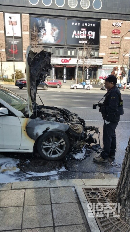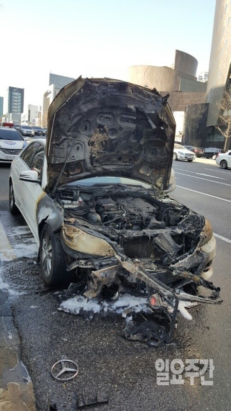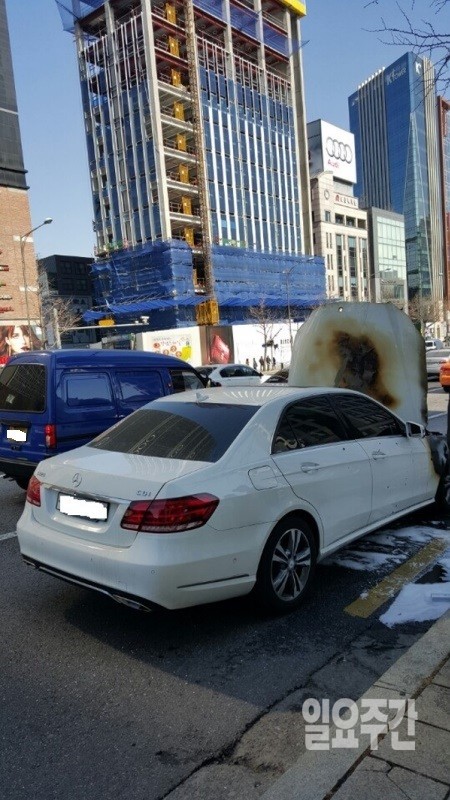 지난달 28일 서울 성북구의 한 아파트 앞 도로에서 벤츠 C220에서 화재가 발생한 것을 비롯해 같은 달 26일 오전 11시 58분경 서울 학동사거리 인근 청담 CGV 건너편에서 주행 중이던 벤츠에서 불이 나 엔진이 전소됐다. 이날 차량 화재 사진은 <일요주간> 독자 노모씨가 현장을 지나던 중 사고 현장을 목격하고 스마트폰으로 촬영해 본지에 제공했다.