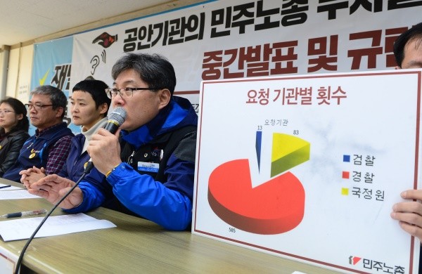 민주노총이 공개한 자료에 따르면 사찰 기관별로 경찰이 585건으로 가장 많았고 뒤를 이어 국정원 83회, 검찰 13회로 나타났다.