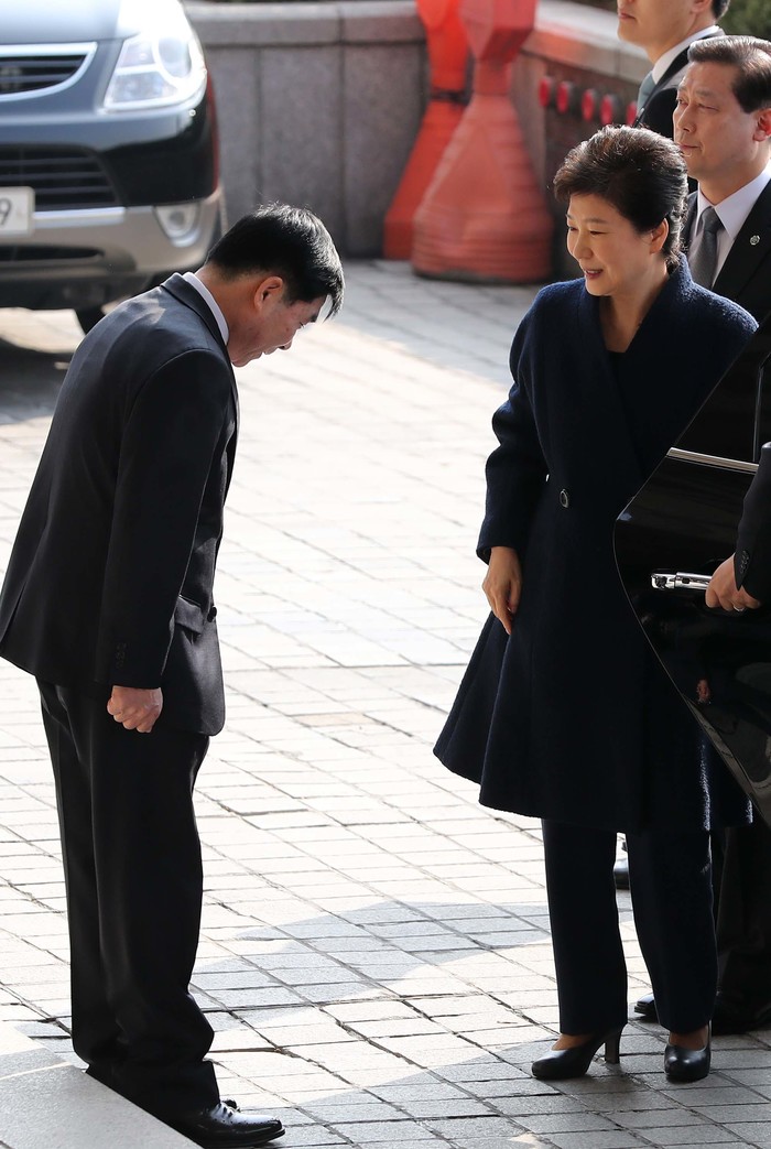 | ▲ 박근혜 전 대통령이 21일 오전 피의자 신분으로 서울 서초구 서울중앙지검에 출석하며 검찰 관계자의 인사를 받고 있다. | ||