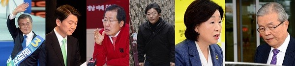 | (왼쪽으로부터) 더불어민주당 문재인, 국민의당 안철수. 새누리당 홍준표. 바른정당 유승민, 정의당 심상정. 무소속 김종인 | ||