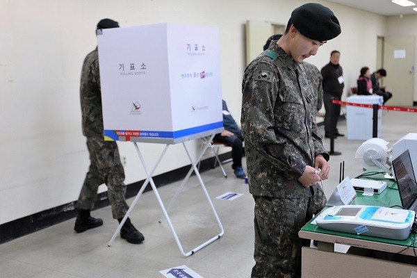 | ▲ 충북 괴산군 육군학생군사학교 장병들이 괴산군민체육센터에 마련된 사전투표소를 찾아 한 표를 행사했다 | ||