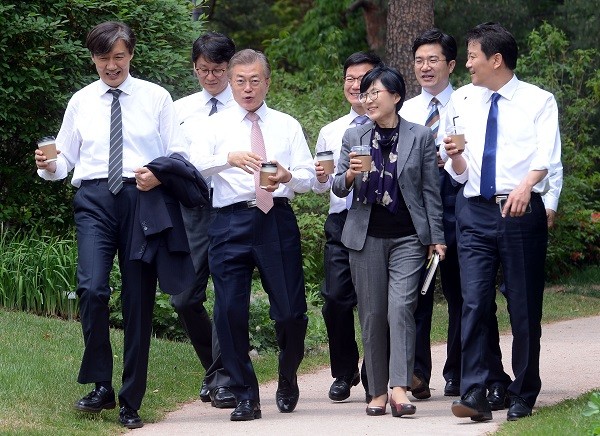 | ▲ 문재인 대통령이 지난 11일 오후 청와대 경내에서 신임 민정·인사·홍보수석비서관, 총무비서관과 산책을 하고 있다. | ||