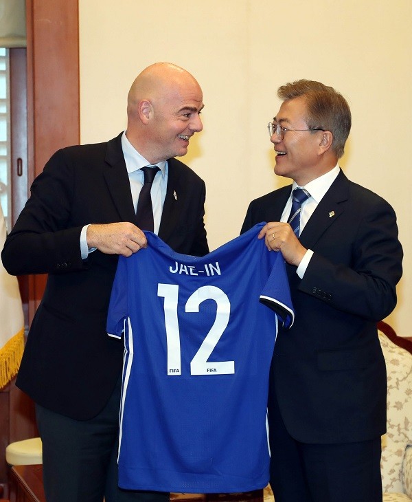 | ▲ 문재인 대통령이 지난 12일 오후 청와대 본관 접견실에서 지아니 인판티노 국제축구연맹(FIFA) 회장으로부터 문 대통령의 이름을 새긴 유니폼을 선물받고 있다.(사진=청와대 제공) | ||