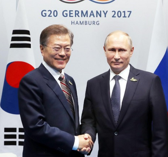 문 대통령은 7일(현지시각) 오후 3시17분부터 50분간 독일 함부르크 주요 20개국(G20) 정상의장 내메세홀에서 푸틴 러시아 대통령과 한-러 정상회담을 갖고 이같이 말하며 “북한의 핵·미사일 도발은 남북 간 평화 뿐만 아니라 동북아 전체의 평화에도 중대한 위협이 되고 있다”고 강조했다.