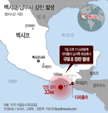 [일요주간=이수근 기자] 7일 오후(현지시간) 멕시코 남부 치아파스 주(州) 피히히아판에서 남서쪽으로 87㎞ 떨어진 태평양 해상에서 8.1 규모의 강진이 발생해 15명이 숨졌다.